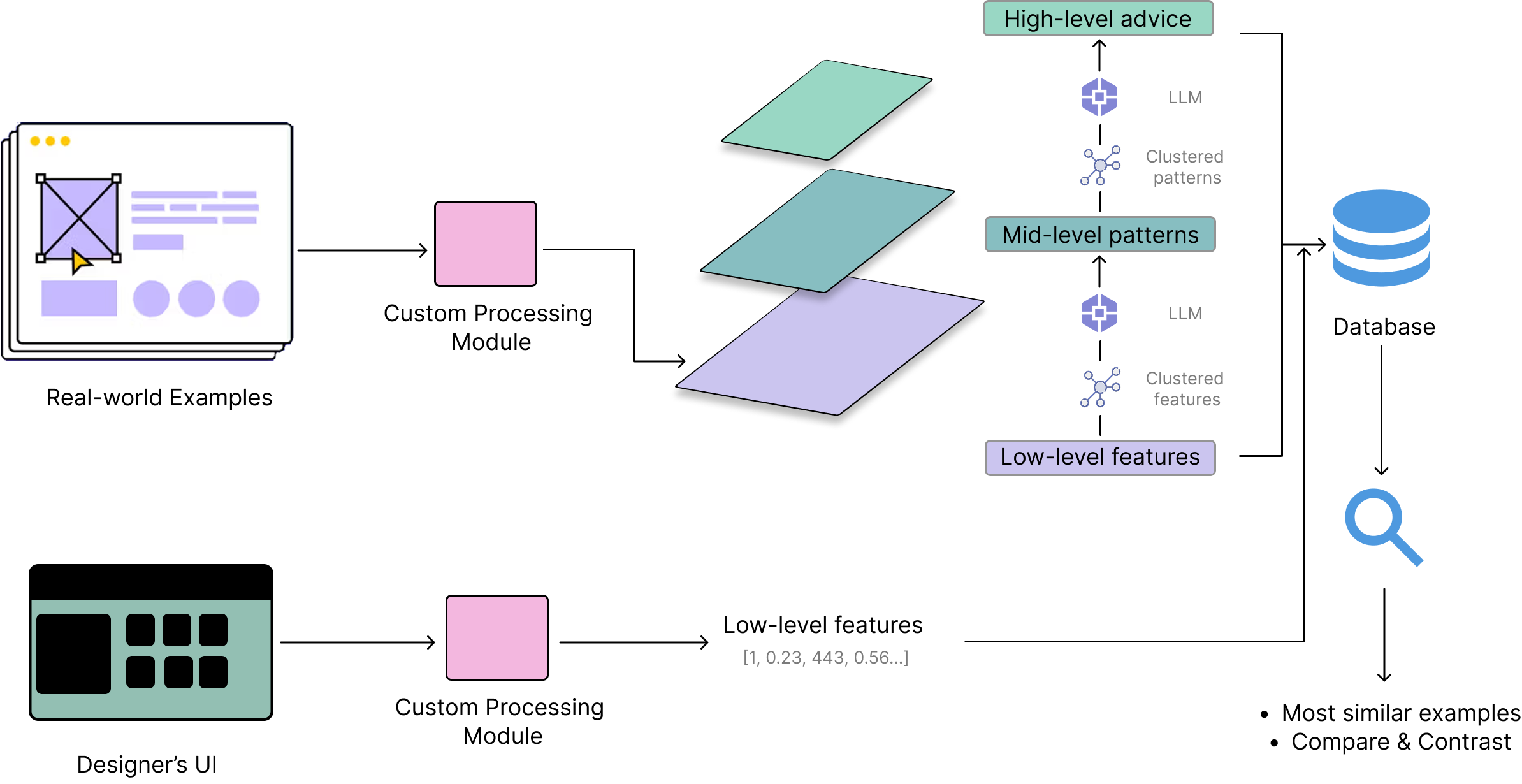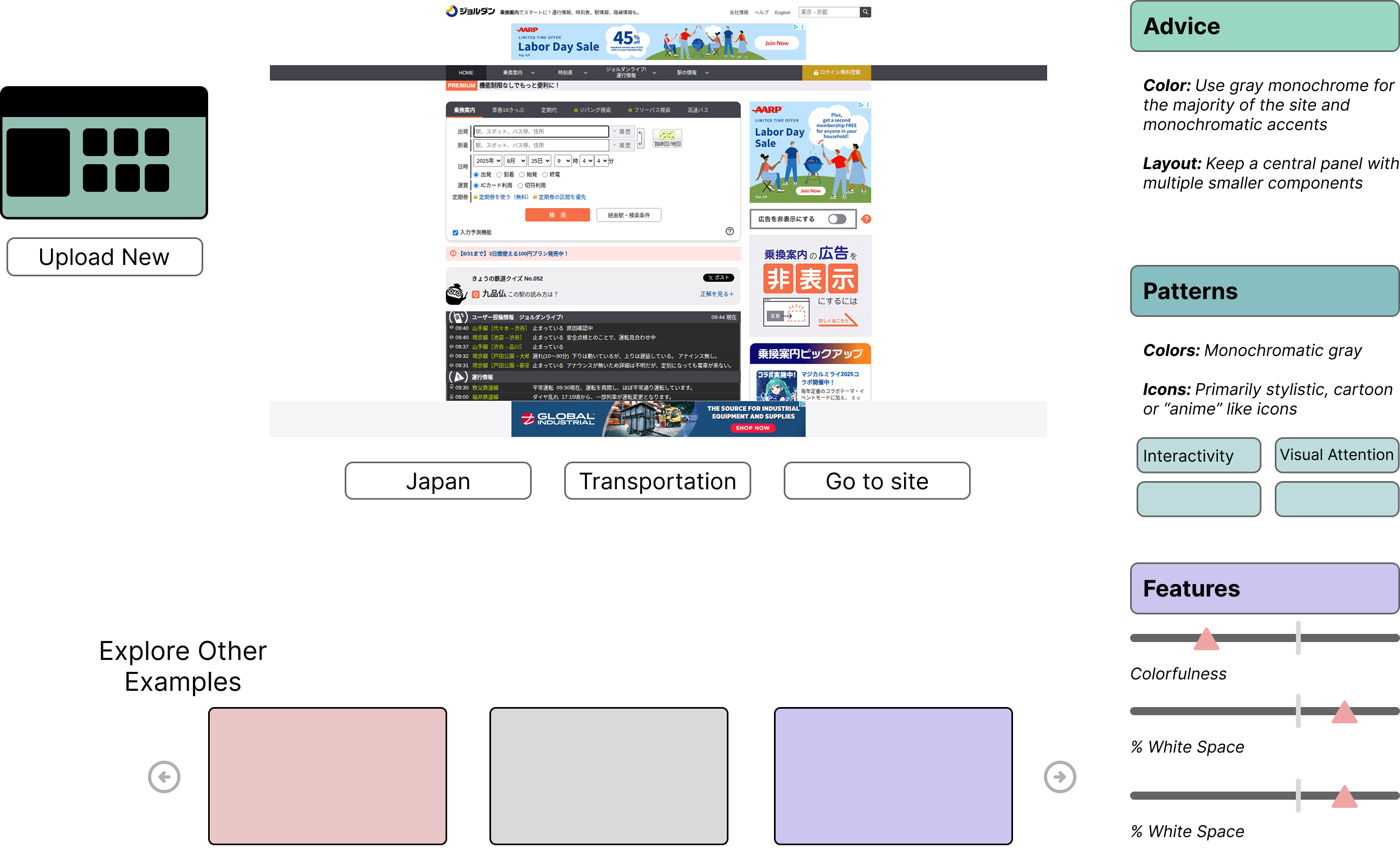 To adhere to these guidelines, we extract low-level features (i.e. colorfulness, top colors found on a website, percentage of whitespace, contour density, etc) used in prior work. To provide understandable metrics and advice, we use the framework of multi-layered abstracted advice and dimensional reasoning. Alone, these metrics do not indicate much. We create these explainability layers by clustering websites based on their features, then providing these features to an LLM to synthesize text-based advice. This clustering is repeated twice for a total of three layers, resulting in "high-level" advice aligned with typical design guidelines seen on the web. Below are high-fidelity mockups of the system. The frontend of the system is being built with Sveltekit while the backend is built with Flask and a NoSQL database. The custom processor to analyze designer images was developed using Python, numpy, pandas, and PyTorch.