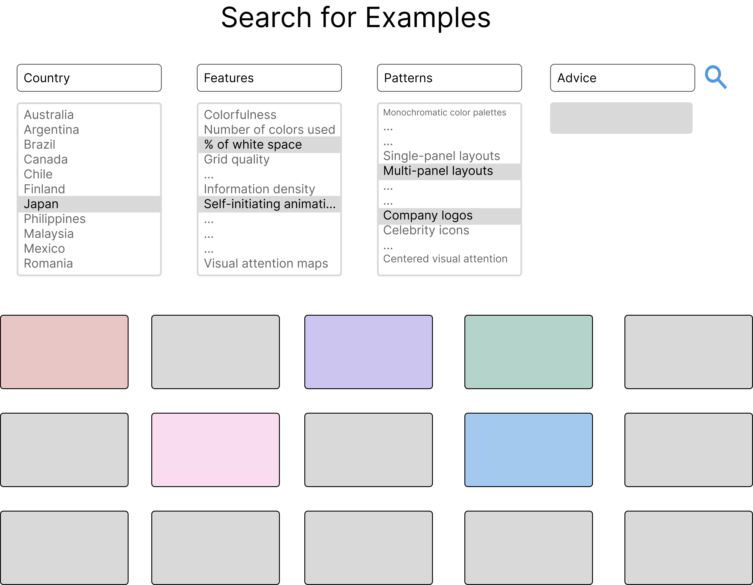 This project creates a creativity support tool for UI/UX researchers to design for demographic groups they are unfamiliar with. Creating a corpus through collecting real-world website data, extracting features with a custom processor using computer vision techniques, then multi-step clustering of features and extracting designer-aligned insights for advice.